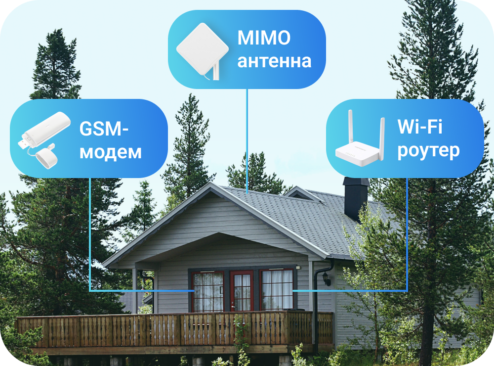 Снаружи устанавливается MIMO антенна, которая принимает и усиливает сигнал. Антенна крепится на крыше или фасаде.